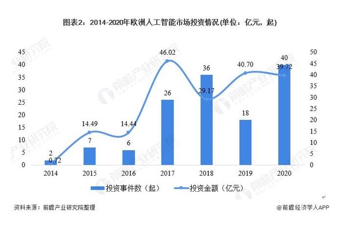 歐洲人工智能處于領先地位,近年來,歐洲為推動人工智能的發展,歐盟制定了覆蓋整個歐盟的人工智能推進政策、研究和投資計劃,協同推進戰略實施,確保在人工智能領域的全球競爭力。從2014-2020年的投資數量和投資金額來看,歐洲人工智能行業的投資規模呈上升的趨勢,但近幾年行業投資熱度有所下降,相對而言保持穩定。2020年,歐洲人工智能相關投資事件為40起,投資金額達到39.72億元。